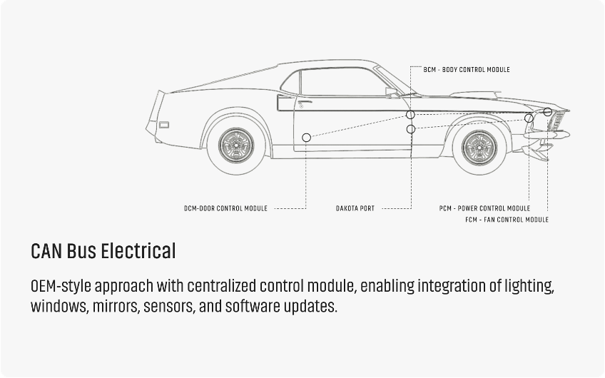 The new electrical system for the Revology 1969 Boss 429 is designed with an OEM-style approach, combining electrical and computer engineering expertise to deliver improved reliability and simplified wiring.