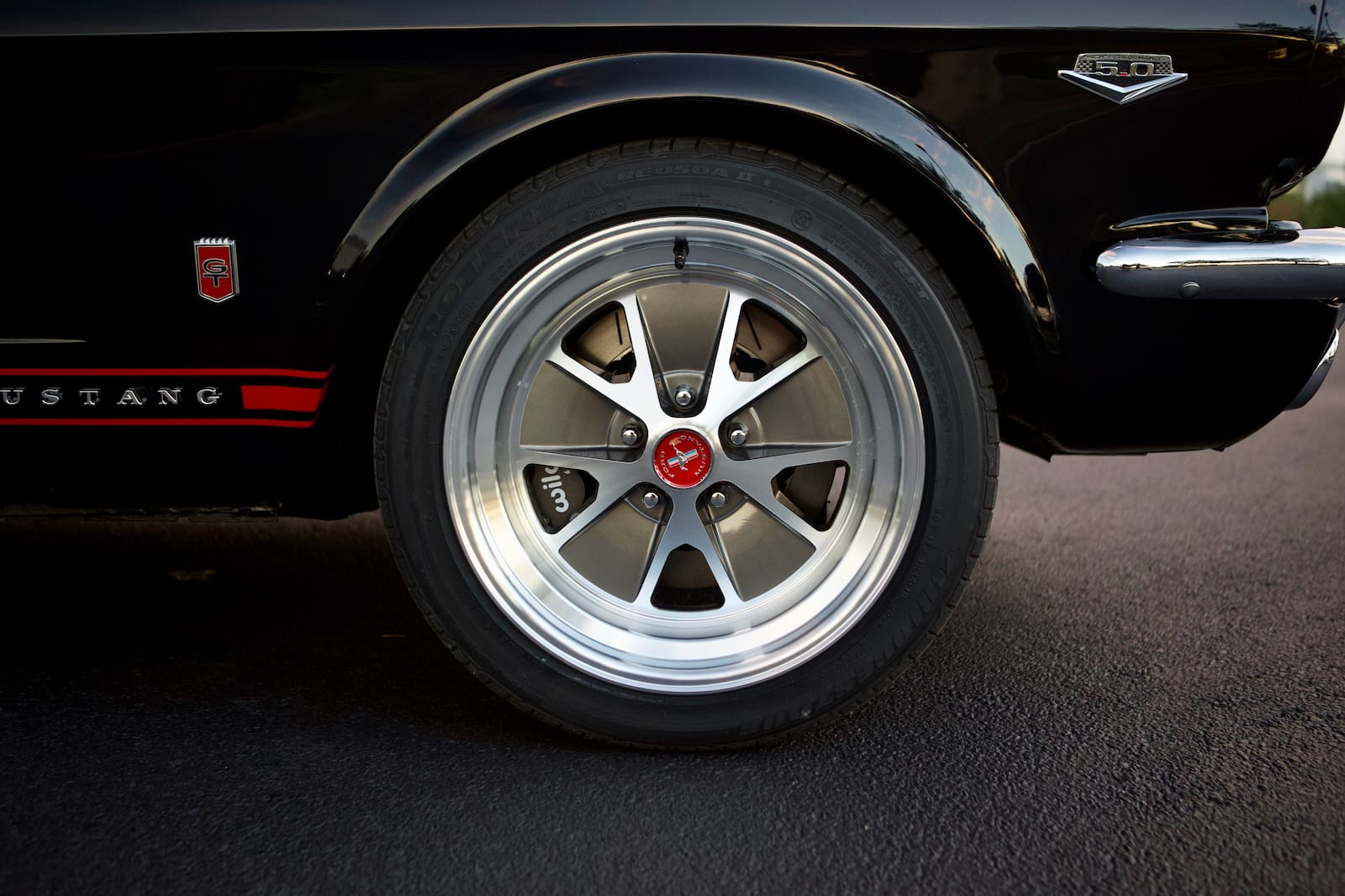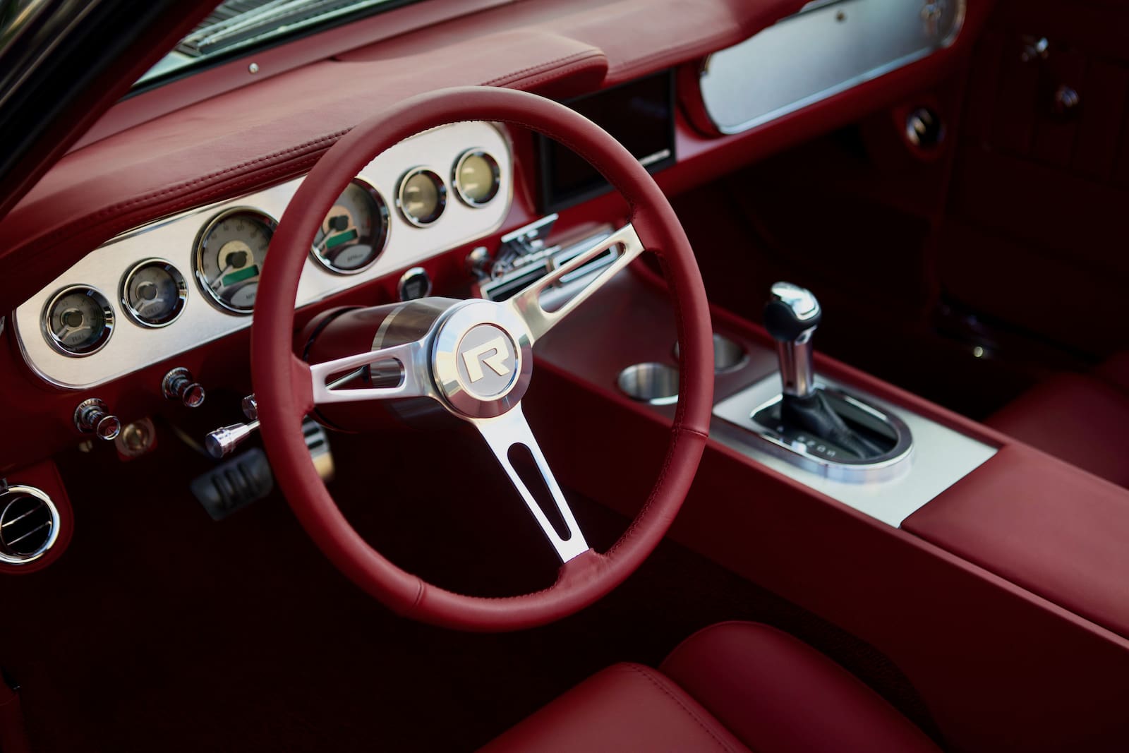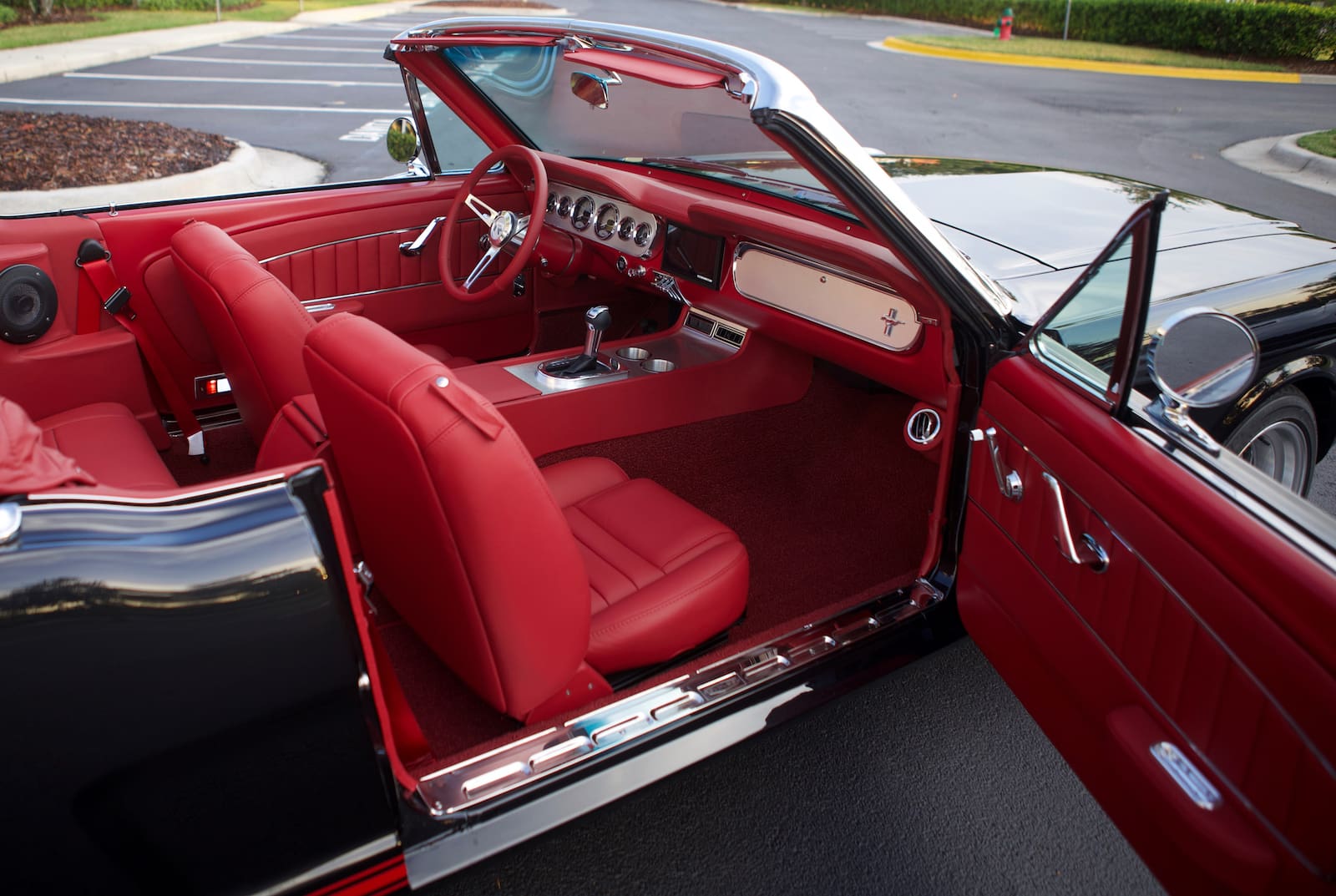 Inside, you’ll find Red (Flamencorot) Nappa Leather interior with power-operated comfortable bucket front seats. The dash and custom full length console feature brushed aluminum inserts. This fastback also features a 3-spoke red leather-wrapped steering wheel and a full array of premium option six vintage-style analog gauges (with additional digital displays), and LED interior lighting.