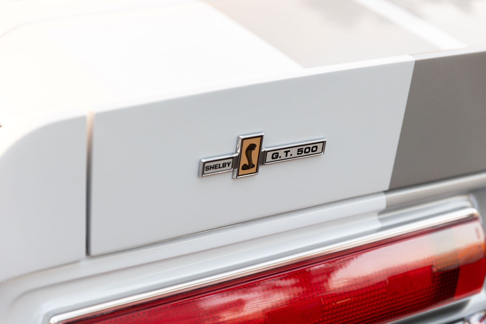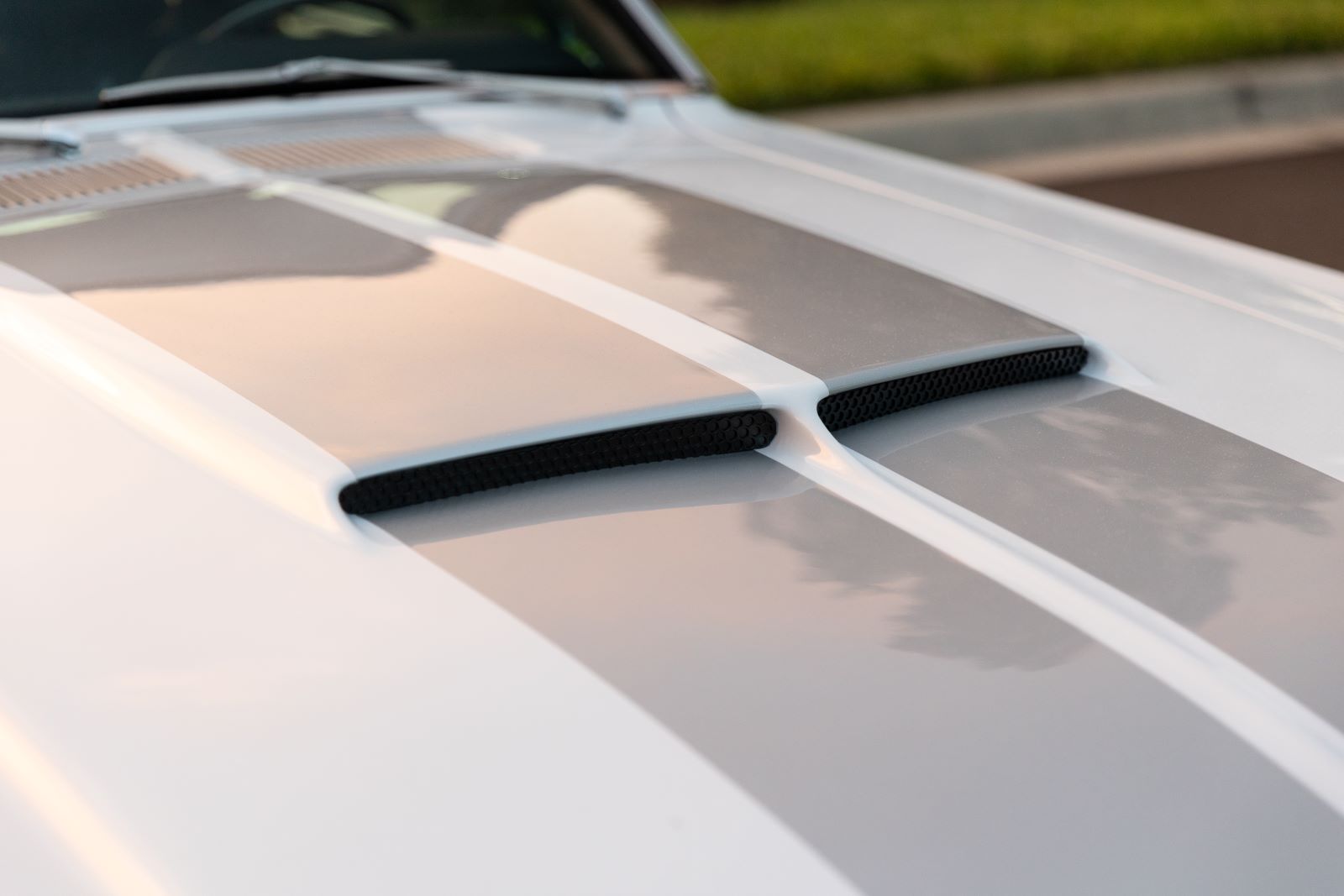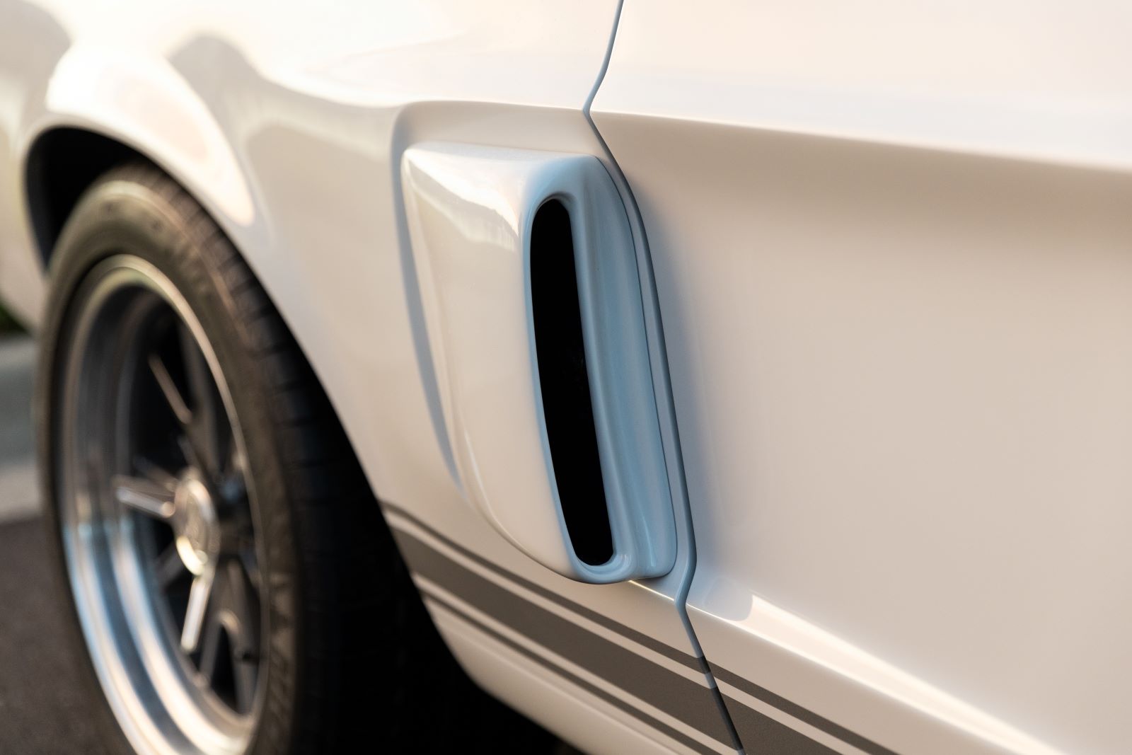 The Shelby GT500 Fastback body is covered with the iconic Shelby paint scheme made up of high quality iconic Glasurit Carrera White Metallic paint, Silver Frost Metallic LeMans stripes painted down the center, and highlighted with GT500 side stripes. It features all the unique Shelby-style panels and scoops, including the scooped hood, which is held closed with stylish polished flush-mount hood latches. The body features 100% new steel unibody construction to ensure each car is built for a long life, starting with a strong foundation. Additional features include modern remote push-button trunk release and polyurethane bonded windshield and backlite glass for increased rigidity and safety.