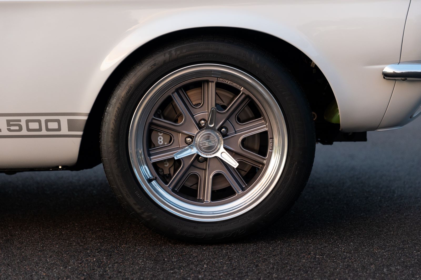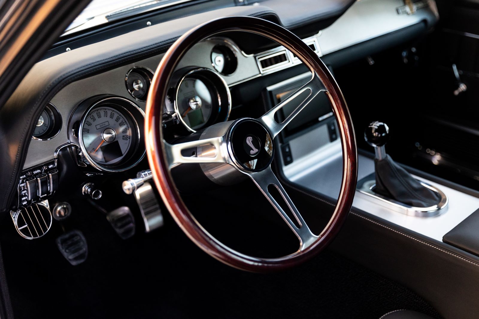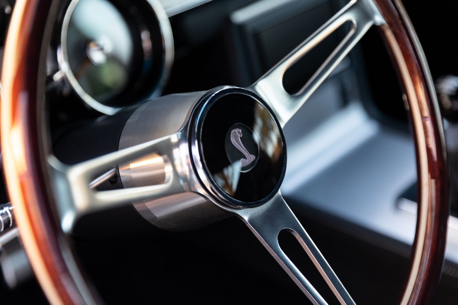This vehicle is equipped with tuned double wishbone front suspension with power rack and pinion steering and 3-link rear suspension for a modern performance driving experience. It stops with gray anodized upgraded brake package of slotted 13.06” rotors and 6-piston calipers in front and 12.88” rotors and 4-piston calipers in the rear. For a classic look, it has 17” x 9.5” Shelby 10-spoke VN427 aluminum wheels.