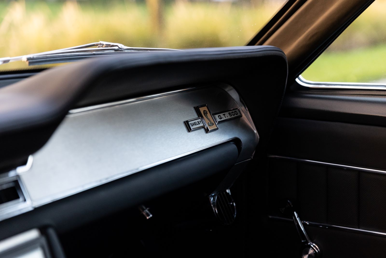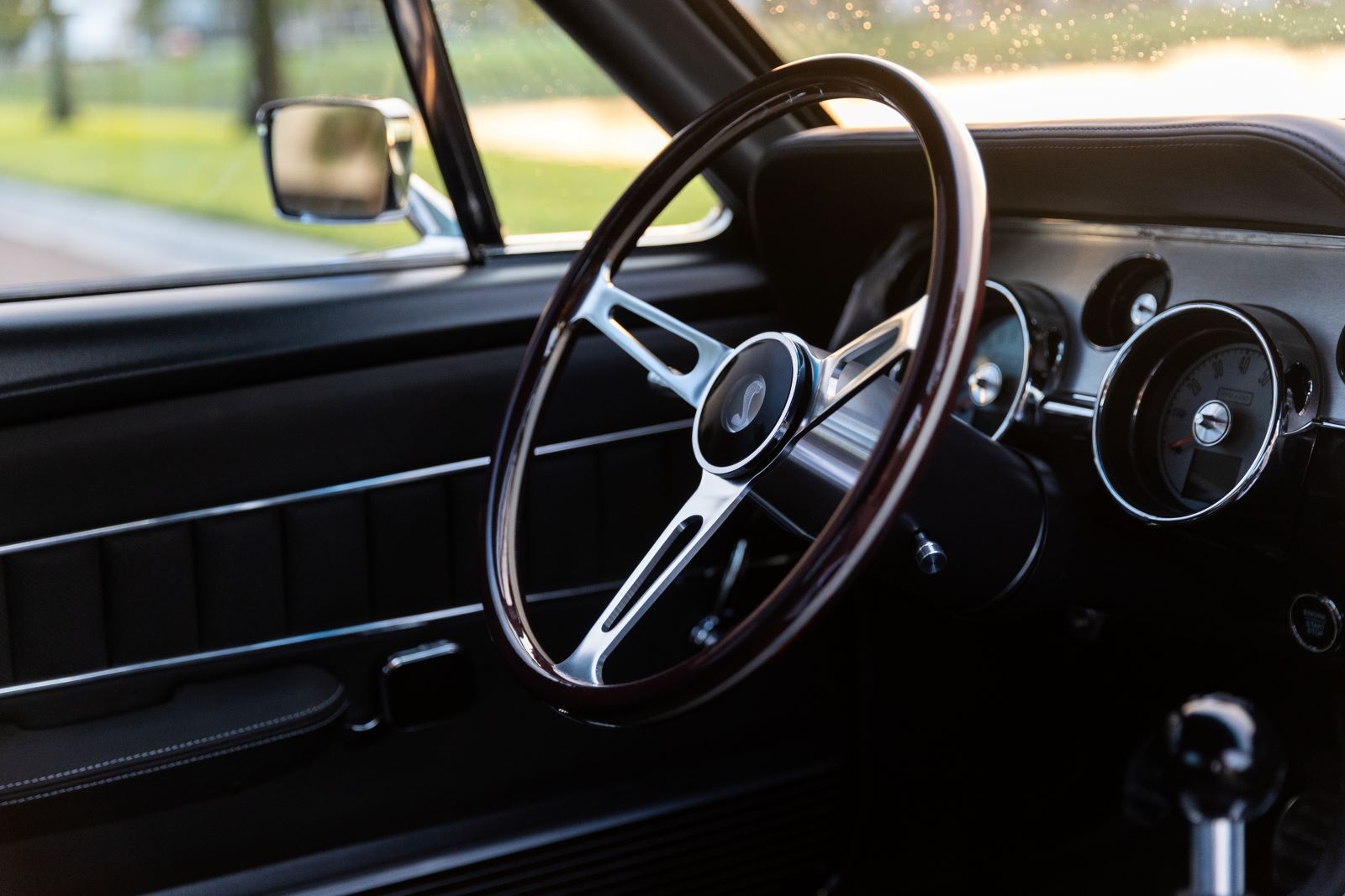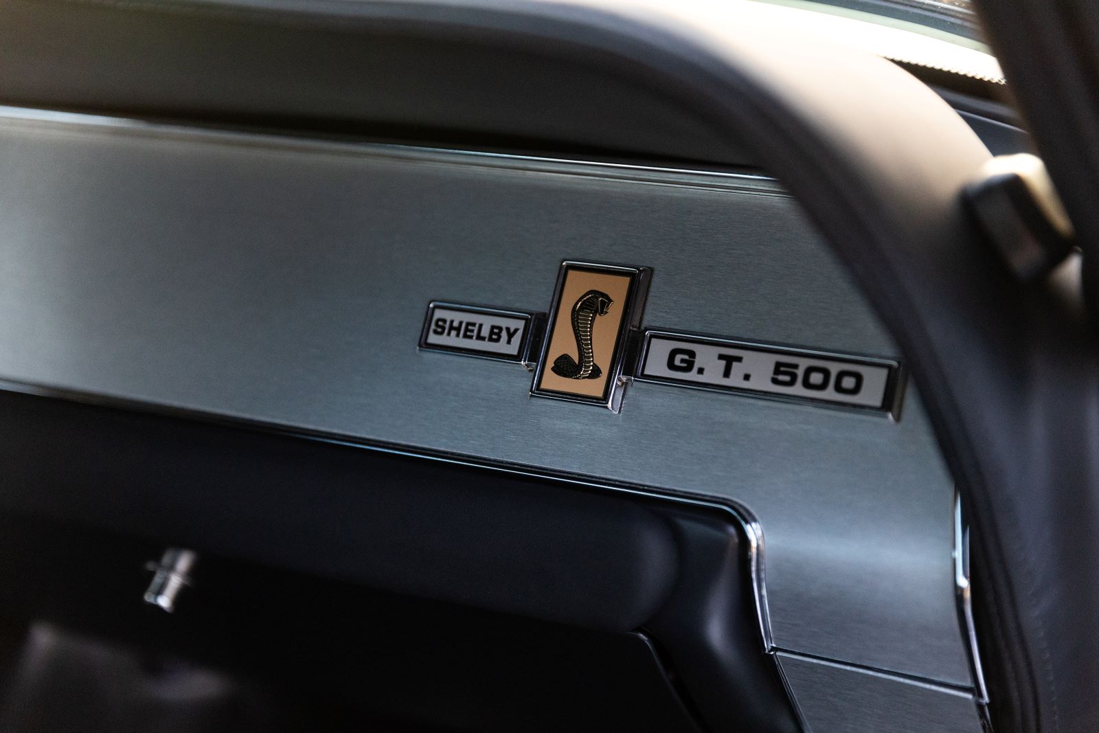 This vehicle is equipped with tuned double wishbone front suspension with power rack and pinion steering and 3-link rear suspension for a modern performance driving experience. It stops with gray anodized upgraded brake package of slotted 13.06” rotors and 6-piston calipers in front and 12.88” rotors and 4-piston calipers in the rear. For a classic look, it has 17” x 9.5” Shelby 10-spoke VN427 aluminum wheels.