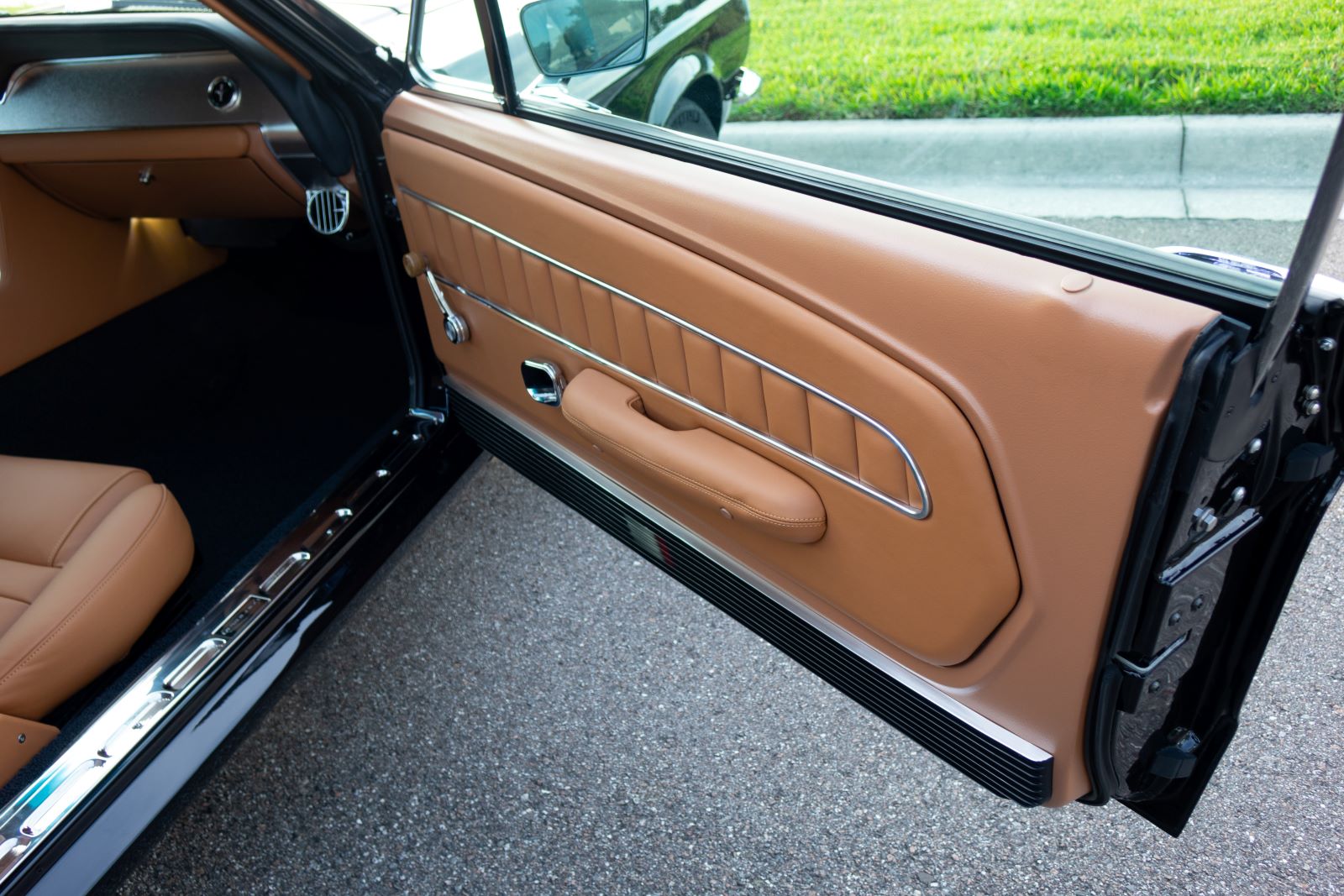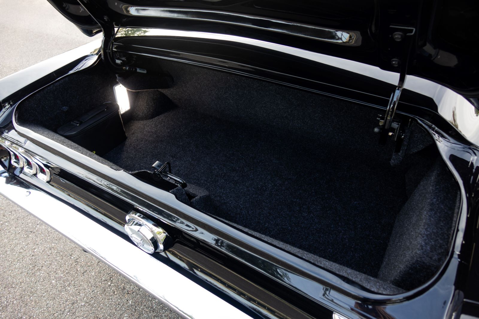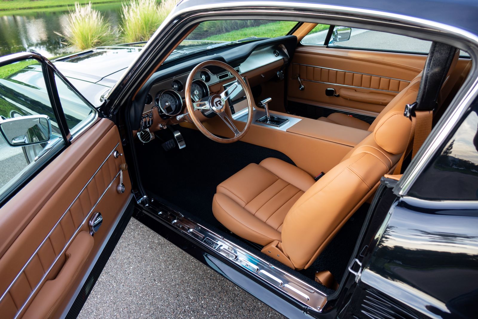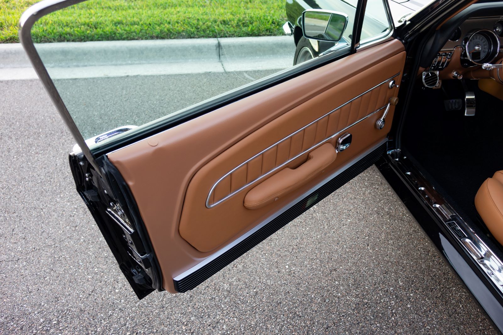 The Mustang GTA 2+2 Fastback body is covered with high quality Glasurit Jet Black Metallic paint. The body features 100% new steel unibody construction to ensure each car is built for a long life, starting with a strong foundation. Additional features include modern door hinges and latches for smooth and quiet operation, modern trunk latch (with remote push button), and polyurethane bonded windshield and backlite glass for increased rigidity and safety.