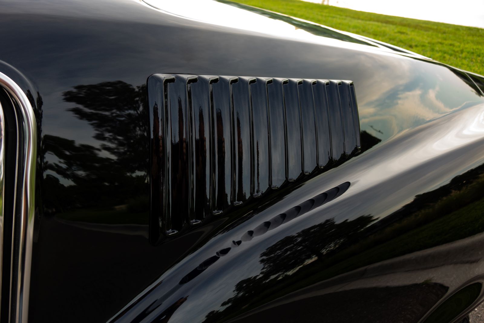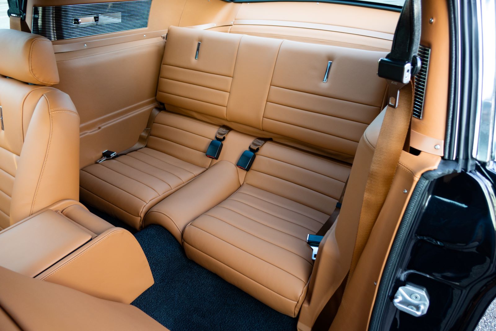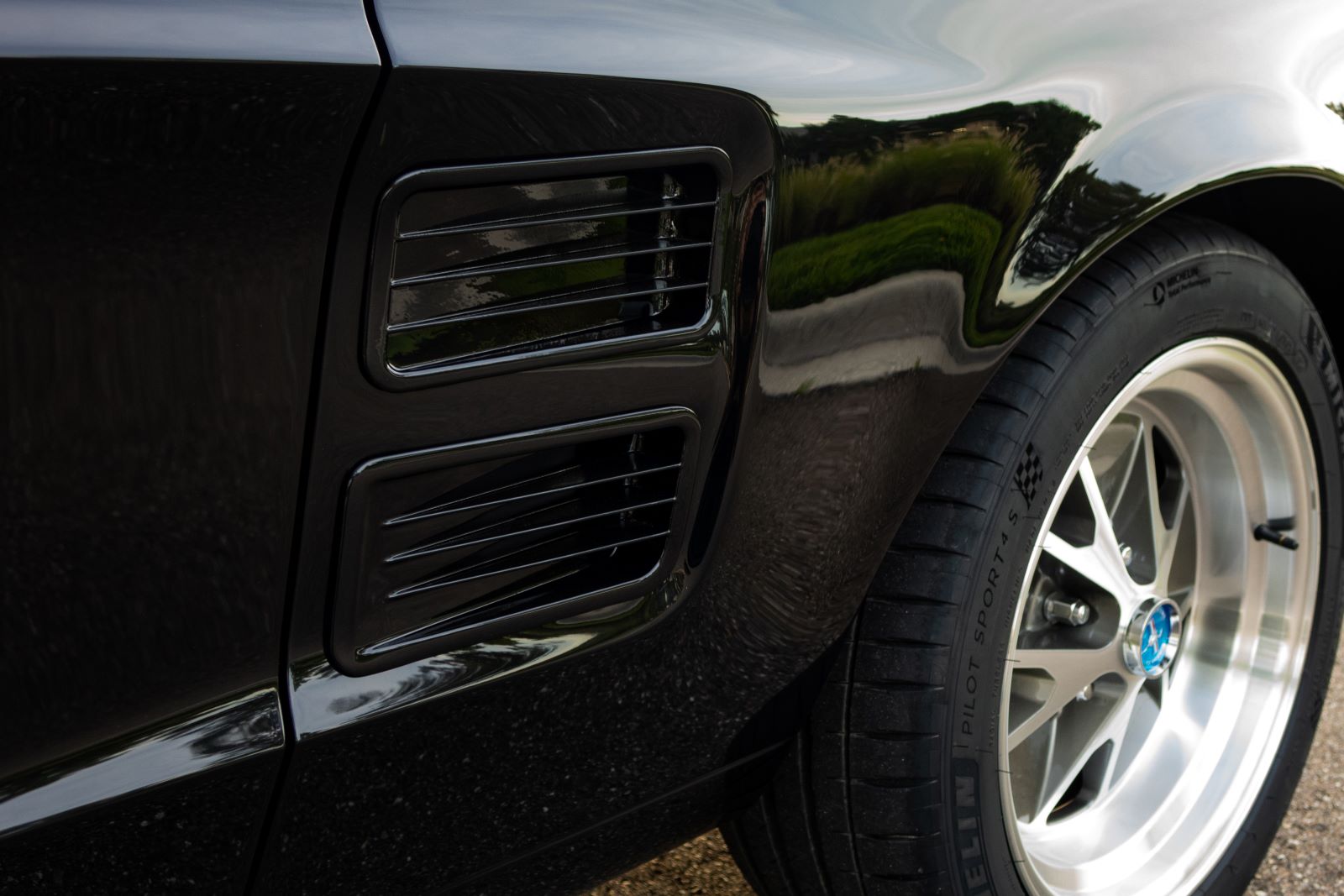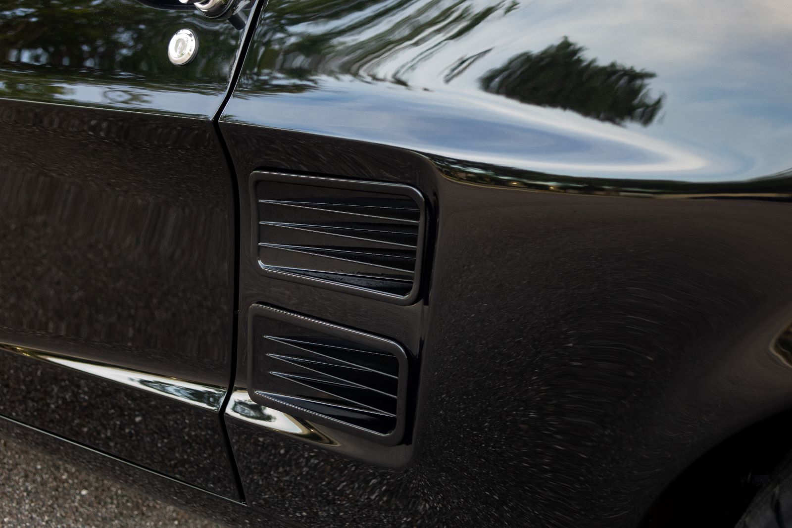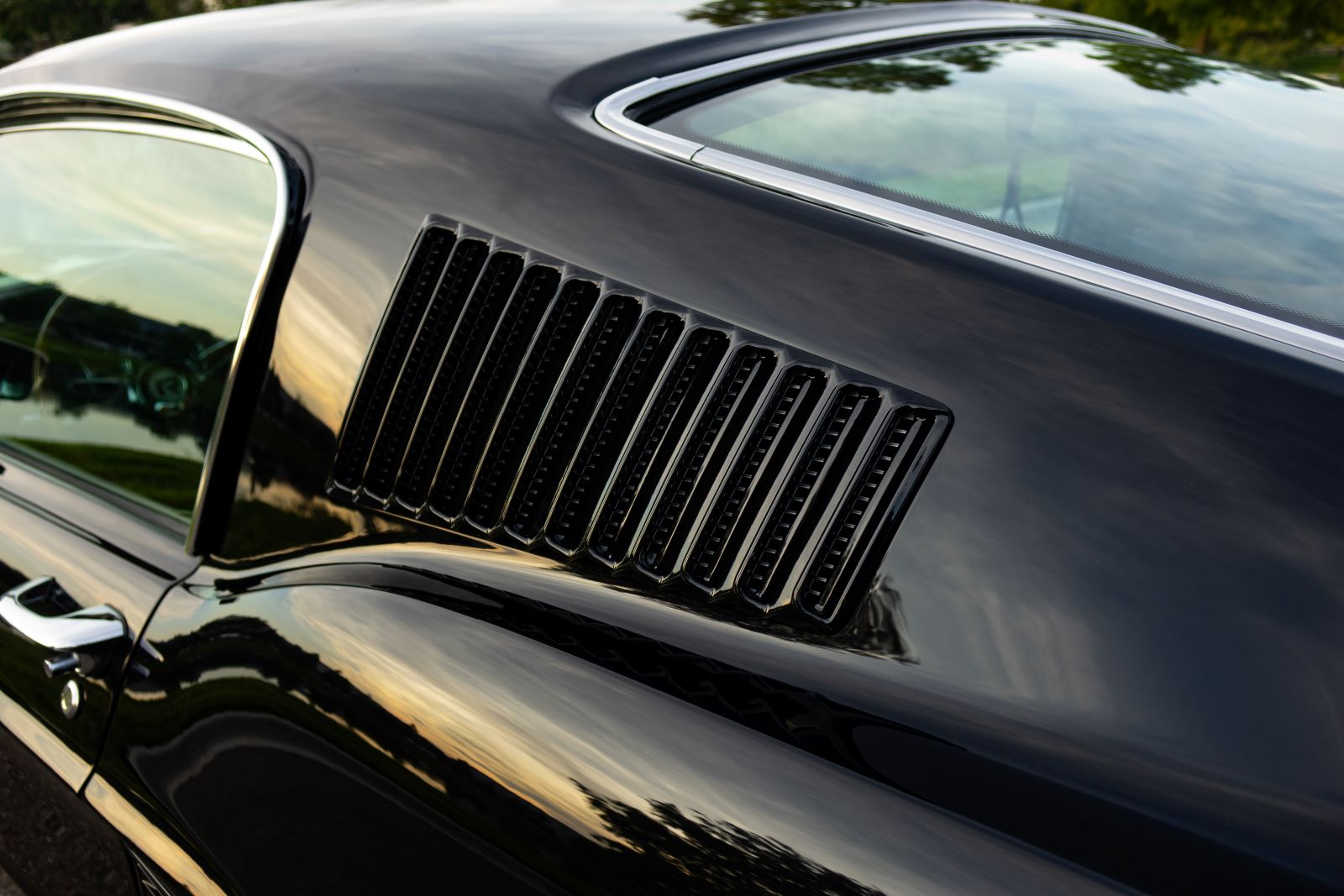 The Mustang GTA 2+2 Fastback body is covered with high quality Glasurit Jet Black Metallic paint. The body features 100% new steel unibody construction to ensure each car is built for a long life, starting with a strong foundation. Additional features include modern door hinges and latches for smooth and quiet operation, modern trunk latch (with remote push button), and polyurethane bonded windshield and backlite glass for increased rigidity and safety.
