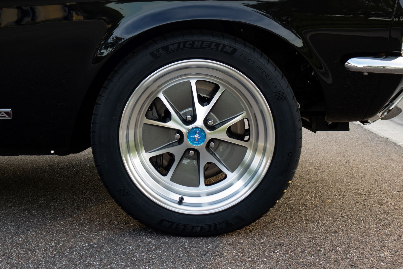 This vehicle is equipped with tuned double wishbone front suspension with power rack and pinion steering and 3-link rear suspension for a modern performance driving experience. It stops with gray anodized Shelby GT brake package of 12.88” slotted rotors and 4-piston front and rear brake calipers. Wheels are a great classic touch with 17” x 8” Styled Aluminum wheels, wrapped with Michelin Pilot Sport 4S P245/40/ZR17 tires.