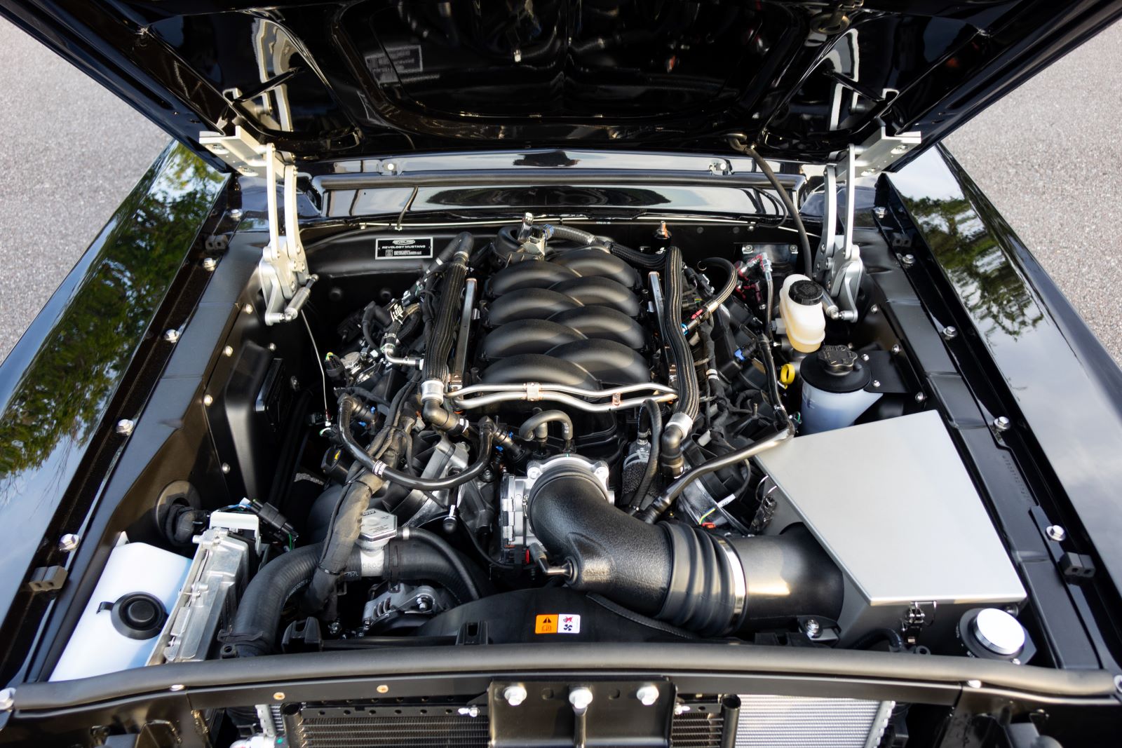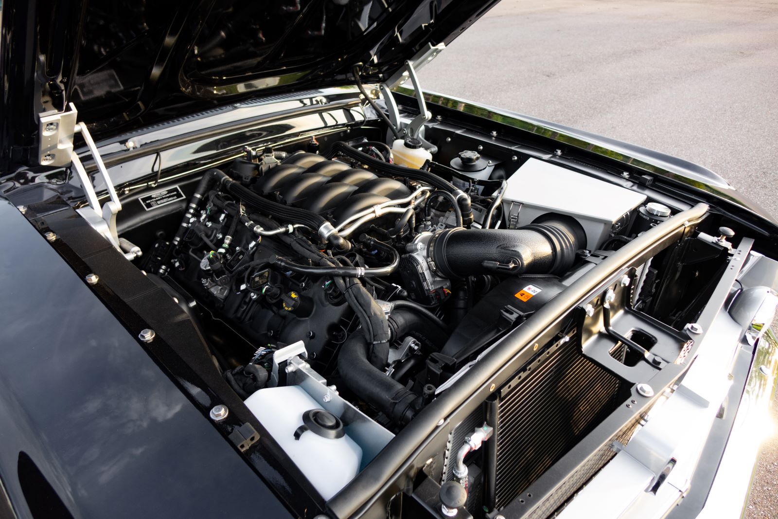 This gem is powered by a 460hp, 420lb-ft Ford Gen 3 5.0 Ti-VCT “Coyote” DOHC V8 engine. Power is transferred to the precision-engineered Ford 8.8” Traction-Lok limited slip differential, 3.73 Ford engineered gear set, through a carbon fiber driveshaft coupled to a 10R80 10-speed automatic transmission.