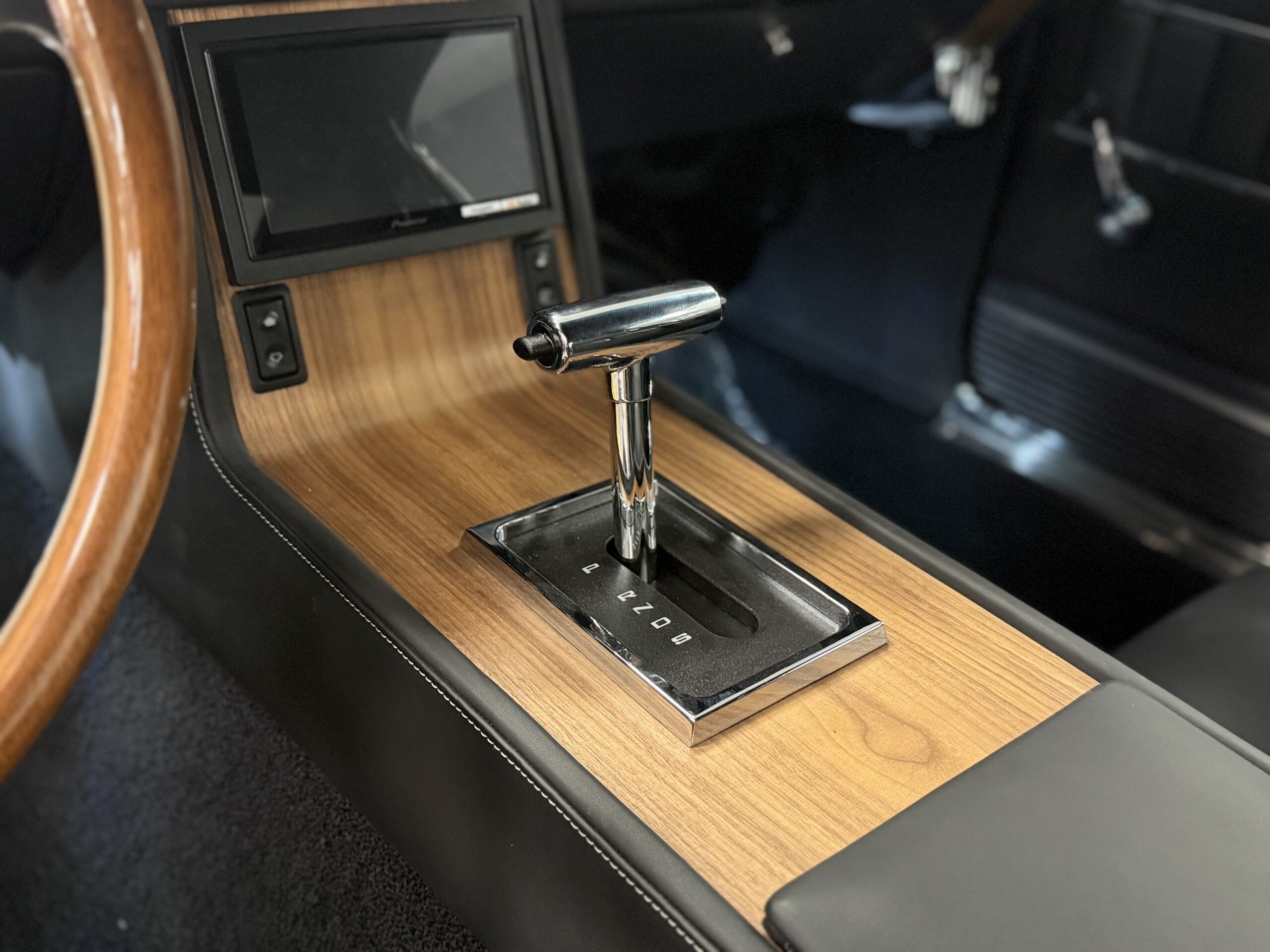 Inside, the cabin is appointed in luxurious black Nappa leather, featuring power-adjustable front bucket seats with head restraints and a fold-down rear seat. The dashboard and full-length custom console are accented with Flat Cut Walnut veneer, complemented by a 3-spoke walnut steering wheel. Modern amenities include a full suite of digital gauges, USB connectivity, and LED interior lighting—blending classic aesthetics with contemporary convenience.